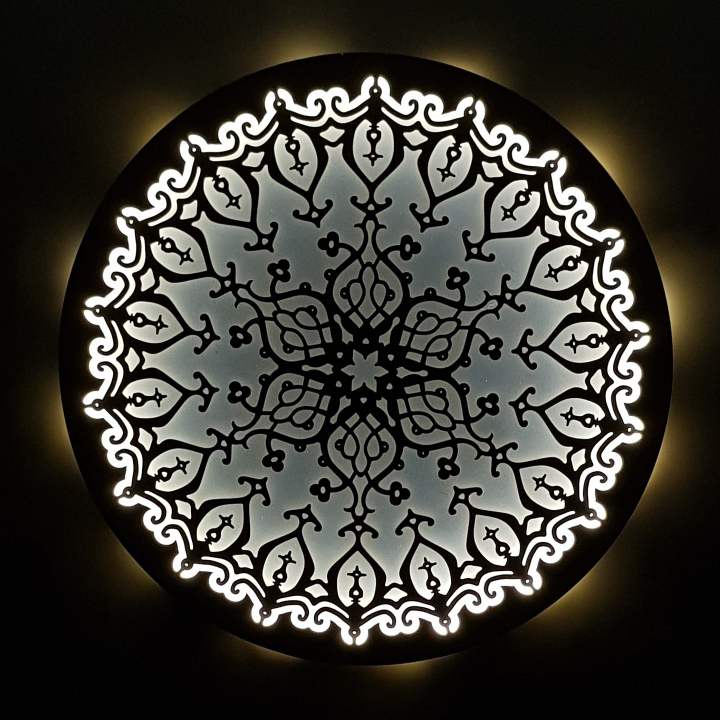 Nota: Se o artesão optar por elaborar a mandala iluminada, não esqueçer de comprar os 3 aros laterais no MDF de 9 milímetros para colarem a fita led de 8 milímetros de largura e do fundo ou tampo, com as duas opções, vazado ou inteiro. No caso de optarem pelo fundo vazado, não esquecer de comprar o suporte com espaçamento, para o efeito ser visto na parede, como na foto demonstrativa do site, estes elementos se encontram na seção de acessórios.